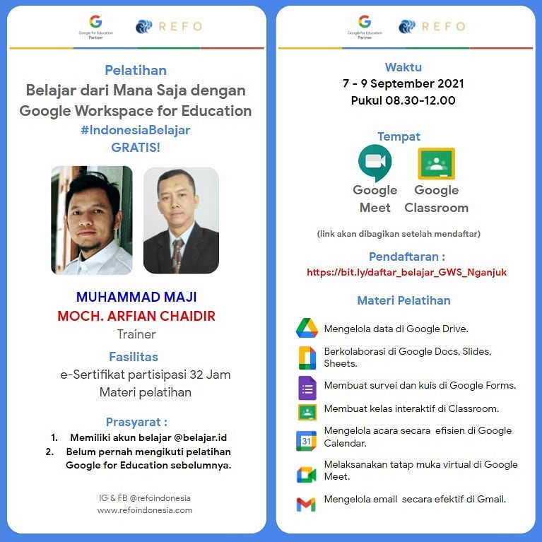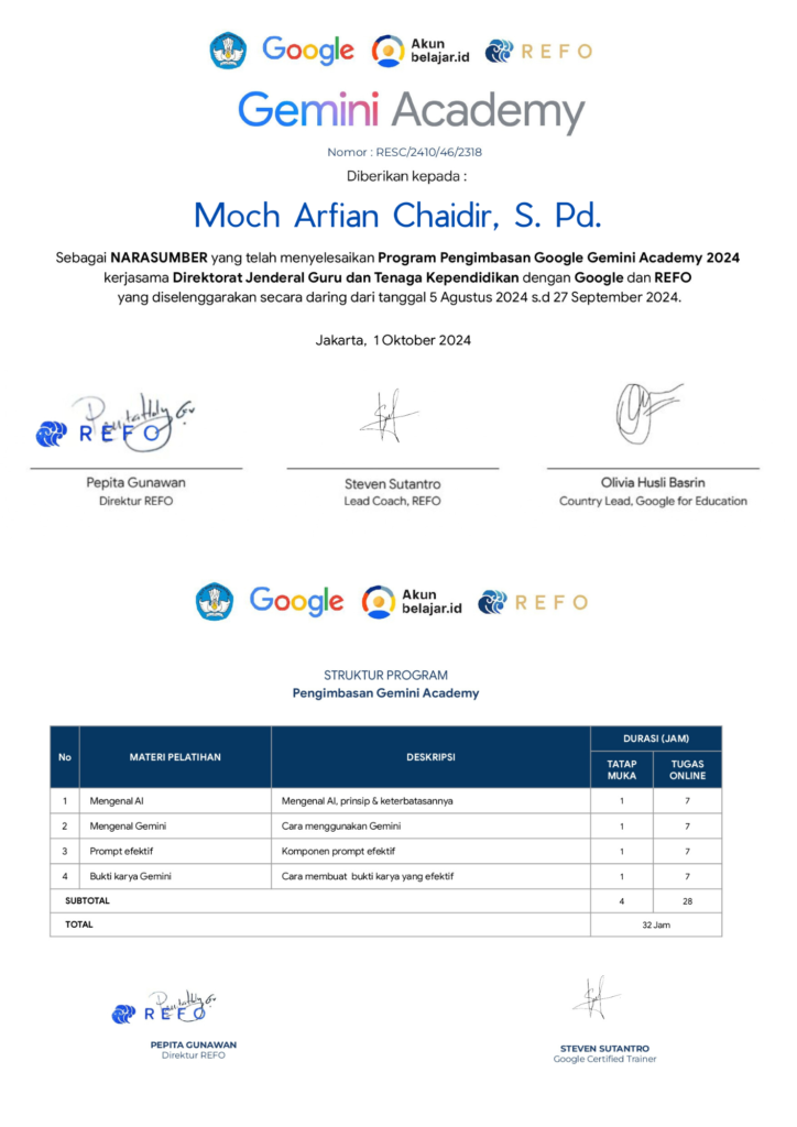 Google Master Trainer adalah program pelatihan yang memperlengkapi pendidik terpilih untuk menginspirasi perubahan dan memimpin pelatihan Google Workspace for Education di akun pembelajaran (belajar.id).